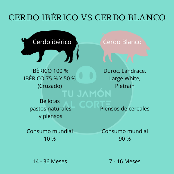 - Jamón 50% Ibérico: El encuentro de dos mundos, con madres ibéricas y padres Duroc. No es el más puro, pero su sabor te conquistará.