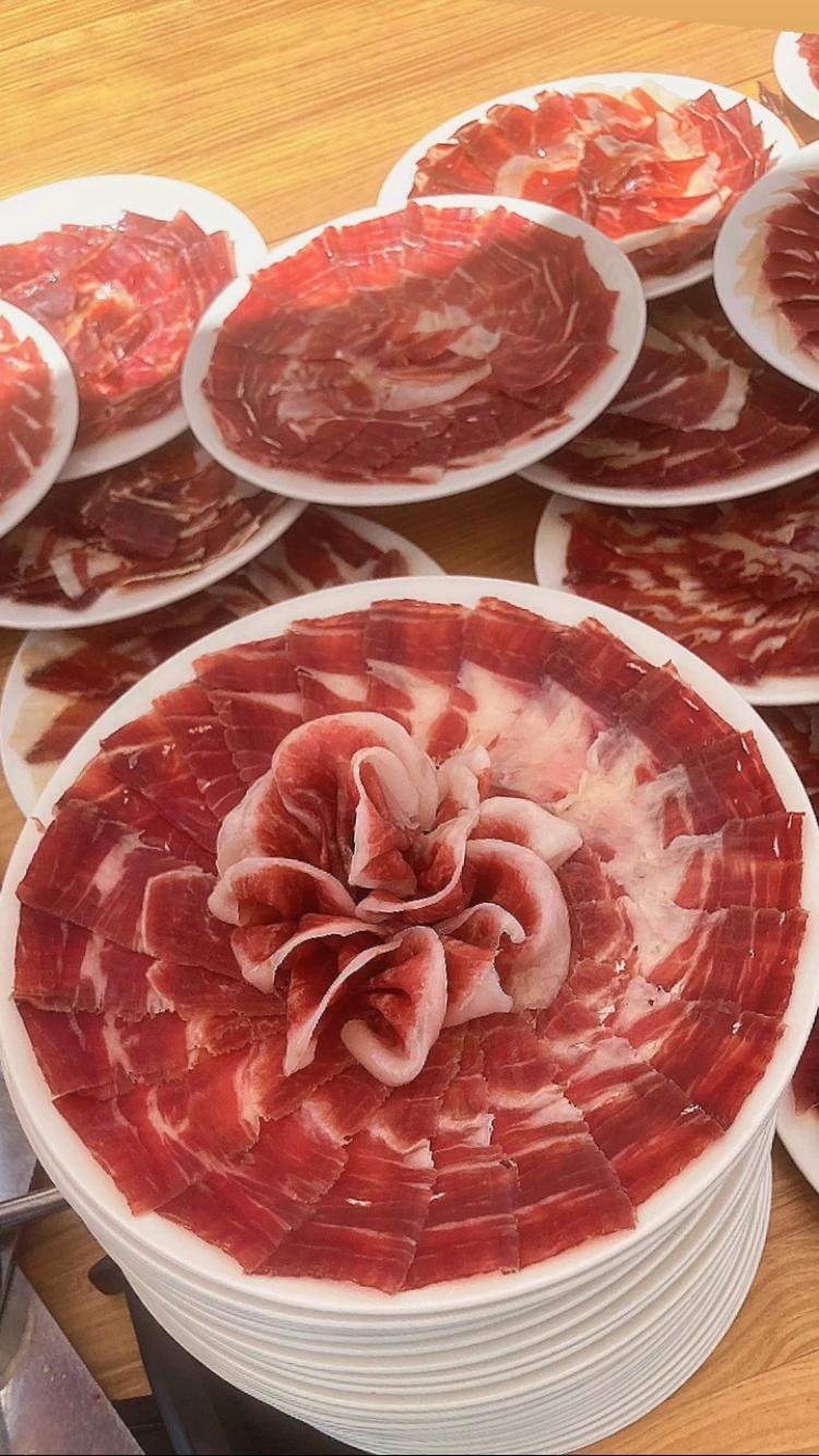 Cada loncha se corta con precisión para disfrutar del auténtico jamón ibérico en su punto óptimo de degustación.