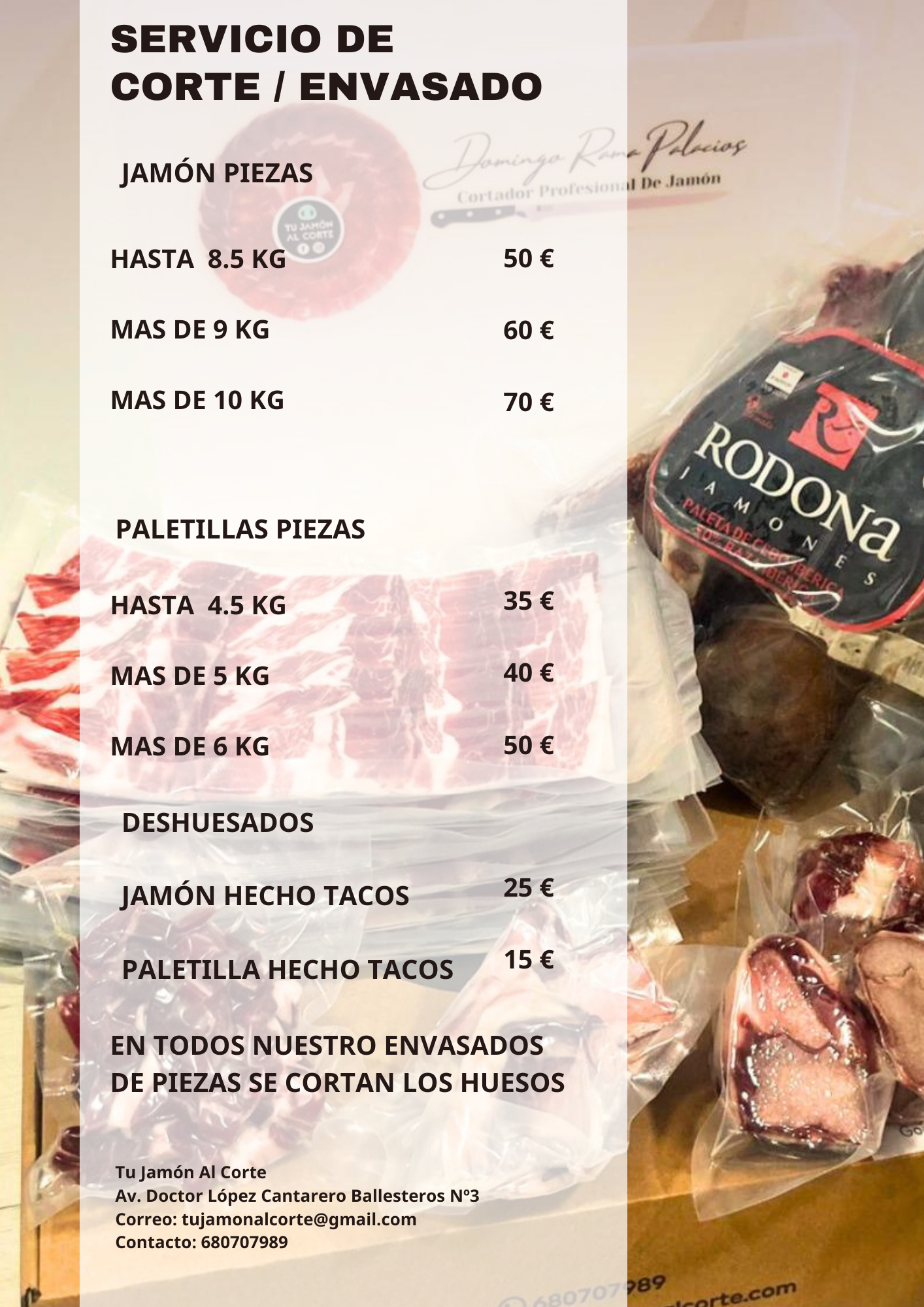 Su jamón será entregado en unos días en una caja totalmente loncheado con sus taquitos y huesos cortados